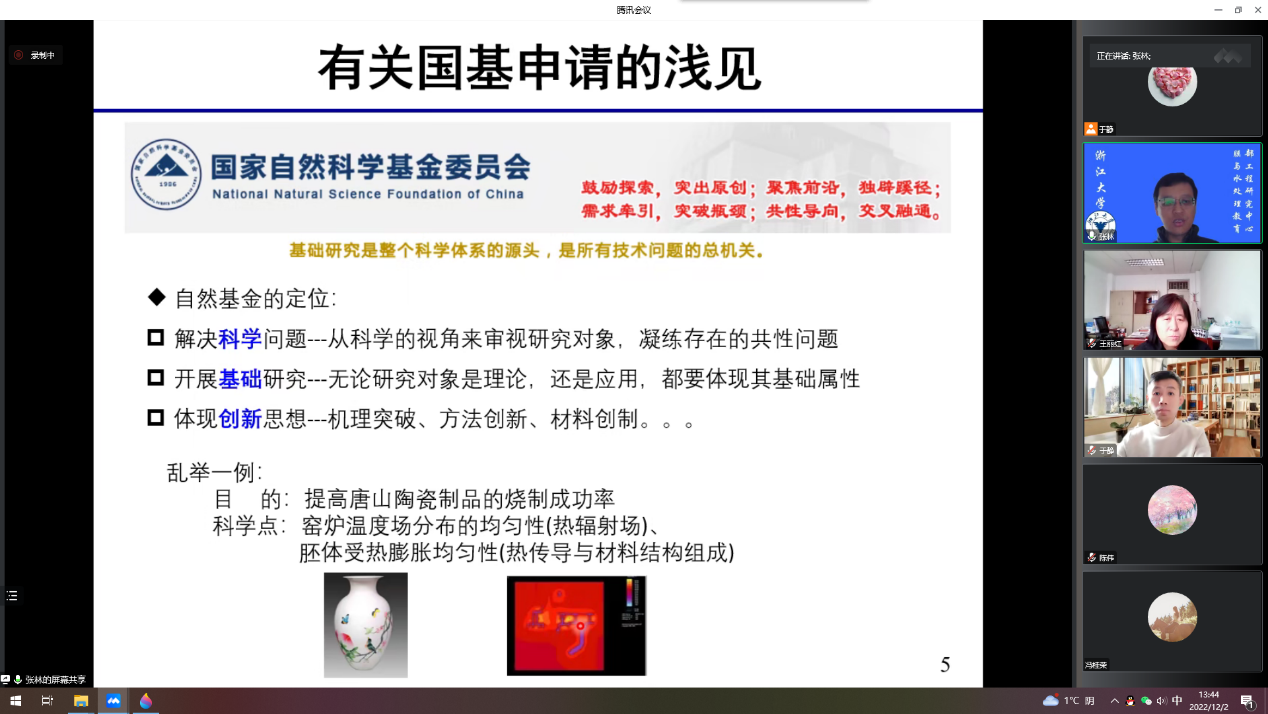 为扎实推进2023年国家基金项目申报工作,进一步提升我校教师的国家基金项目申请书质量,营造良好的申报氛围,加强高层次学术交流,2022年12月2日,化学一流学科邀请国家“百千万人才工程”人才,浙江省“万人计划”领军创新人才,浙江省化工学会常务理事、浙江省膜学会副秘书长,浙江大学张林教授通过腾讯会议线上做主题为“国家自然科学基金申请心得”的学术讲座,yl7703永利集团全体教师参加此次学术交流。