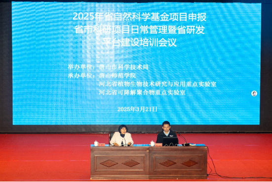 2025321,由唐山市科技局主办,yl7703永利集团科研处、河北省植物生物技术研究与应用重点实验室、河北省可降解聚合物重点实验室承办的2025年省自然科学基金项目申报、科研项目日常管理暨省研发平台建设培训会在yl7703永利集团小剧场召开。会议特别邀请了华北理工大学李建副教授、王曼曼副教授分别作题为“河北省自然科学基金申报书撰写要点及经验分享”和“省基金申报书撰写策略与技巧”的学术报告。会议由yl7703永利集团科研处处长王丽红主持,唐山市科学技术局科技平台与基础研究科科长宋志鹏、副科长窦祎明、裴熠文、河北省植物生物技术研究与应用重点实验室主任范永山、河北省可降解聚合物重点实验室主任于静等出席了本次会议,来自唐山市各县(市、区科技管理部门关负责同志、唐山市各高校院所、大型医院以及国家省市属企业科研管理部门负责同志以及河北省自然科学基金、唐山市基础研究在研项目负责人参加了会议。